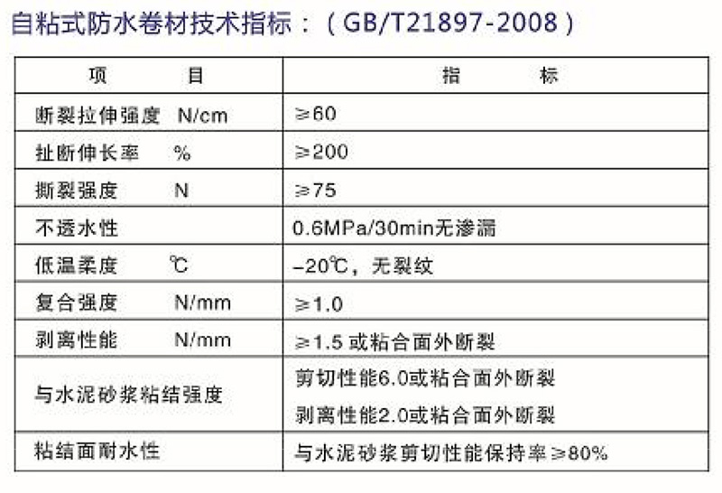 高分子自粘式防水卷材是近幾年發(fā)展的一種具備承載功能的新型防水材料,具有國際 水平的優(yōu)質防水卷材。通過獨特的高分子聚合物膠料與水泥漿料的濕固化反應,使傳統的粘結變成了濕固化反應粘結:把傳統粘結在基層上防水材料變成了采用預鋪式背粘在結構本體上,與現澆混凝土持久地緊密粘在一起,有效地防止地下水滲入,且不受混凝土地下結構產品沉降影響。解決了長期以來地下竄水難題。