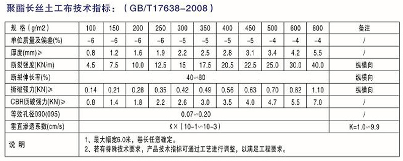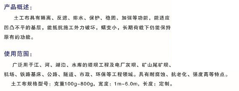 該產(chǎn)品具有優(yōu)良的過濾作用、排水作用、隔離作用、加筋作用、防護(hù)作用。可廣泛用于鐵路、公路、運(yùn)動(dòng)館、堤壩、水利建筑、隧道、沿海灘涂、圍懇、環(huán)保、電廠、機(jī)場等工程。
